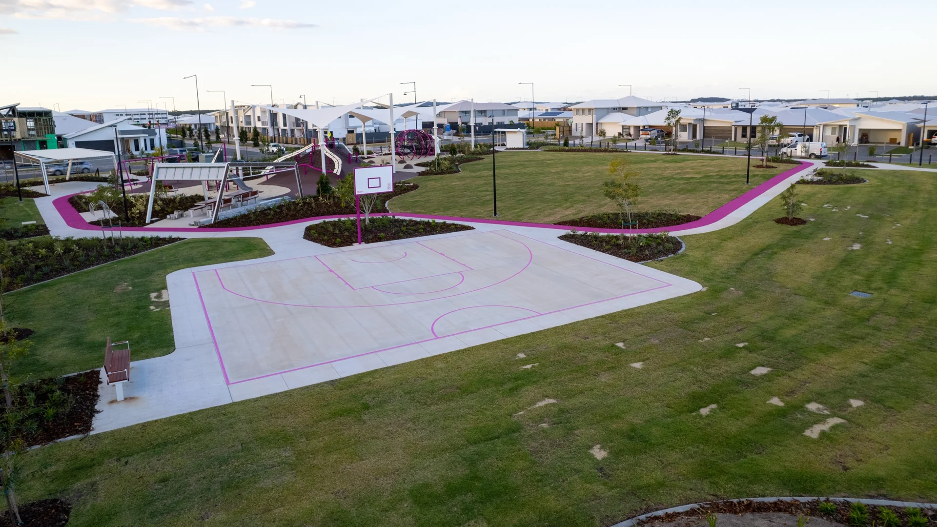 There is a basketball half-court to shoot some hoops, and a bike path circuit which snakes through and around the park.